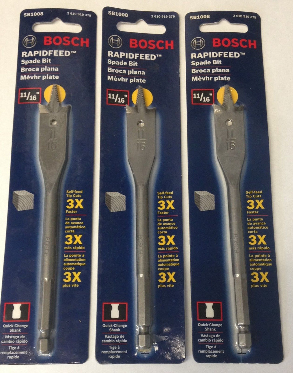 SB1008 BIT 11/16 RAPIDFEED SPADE Designed to answer the needs of professional users in terms of speed, ease of use and hole quality. A first for spade bits, full cone threaded tip provides the speed needed to drill faster and it pulls the bit through the material with less effort and vibration than other spade bits. 1/4” hex shank.
