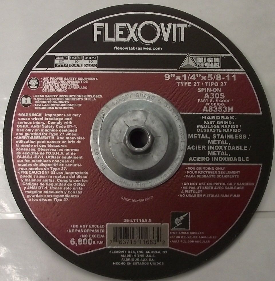 Flexovit A8353H 9" x 1/4" x 5/8-11 Metal Stainless Grinding Wheel USA