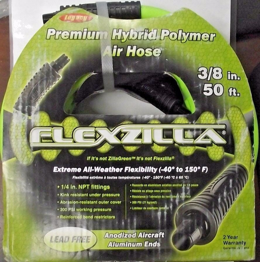 Flexzilla is a revolutionary air hose featuring a Premium Hybrid Polymer material that redefines flexibility. Flexzilla hose characteristics offer zero memory allowing it to lay-flat exactly where you drop it and wont work against you during operation or coiling after use. Flexzilla offers extreme all-weather flexibility, even in sub-zero conditions. Extreme all-weather flexibility, even in sub-zero temperatures (-40 degrees F to 140 degrees F) Zero memory Kink resistant under pressure Excellent abrasion-resistant outer cover Maximum working pressure: 300 psi 3:1 safety factor Includes bend restrictor that reduces wear and tear, prolonging the life of the hose Anodized aircraft aluminum ends