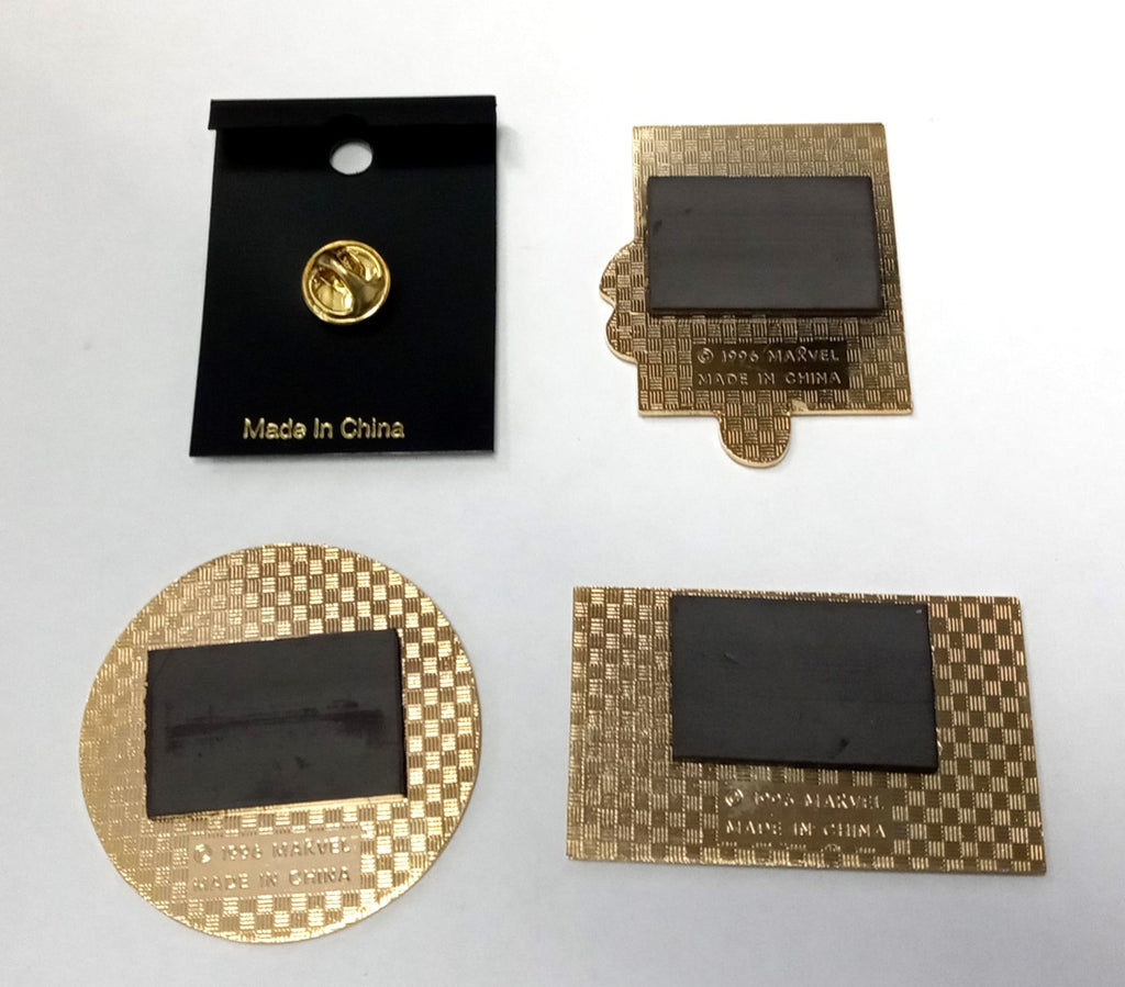 The metal, enamel magnets and pin may have yellowed due to age. The soft magnets may have plasticizer on the back, but they still stick to the fridge.